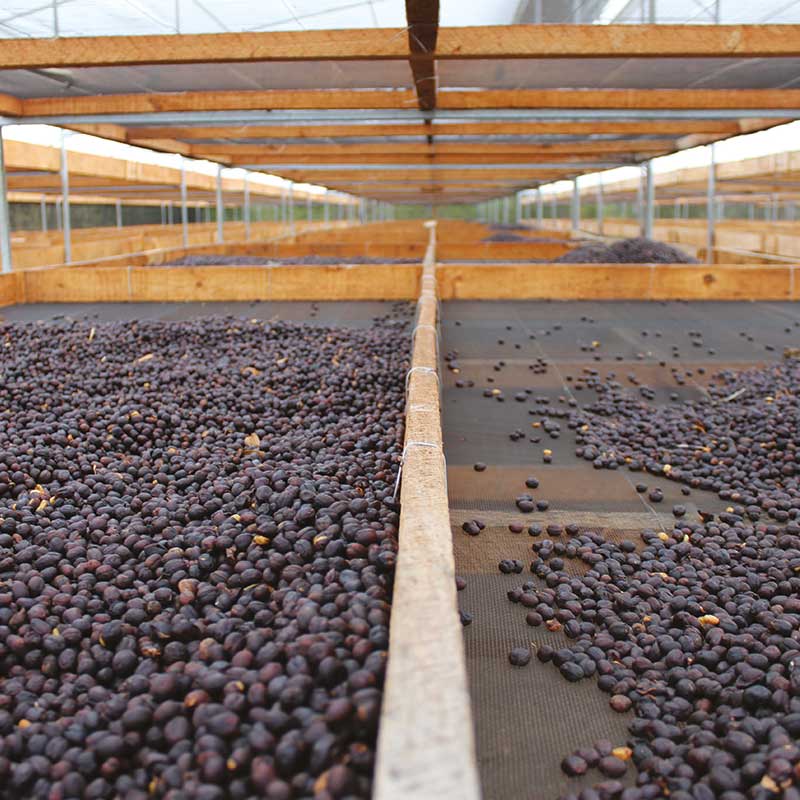After the coffee is harvested, it is measured, the beans are selected, floated, pulped, and then left to ferment for 18 to 24 hours. After this, they are washed with clean water. The coffee is then transported in plastic bags and new jute sacks, taking special care to ensure cleanliness during transportation. The coffee received at the dry mill is sent to African drying beds, which are covered with a roof inside a microtunnel to prevent any contact with the ground. Plastic rakes are used to move the coffee. Once dry, the coffee is stored in a specific area within the warehouse, always separate from the other coffees handled by the mill. When ready for export, the coffee is lifted from the patios to achieve a humidity level between 11 and 11.5%. It is then stored in warehouses for about a month, before it is hulled, sorted according to the customer's requirements, and packed in new jute sacks and Ecotact bags, with the corresponding ICO.