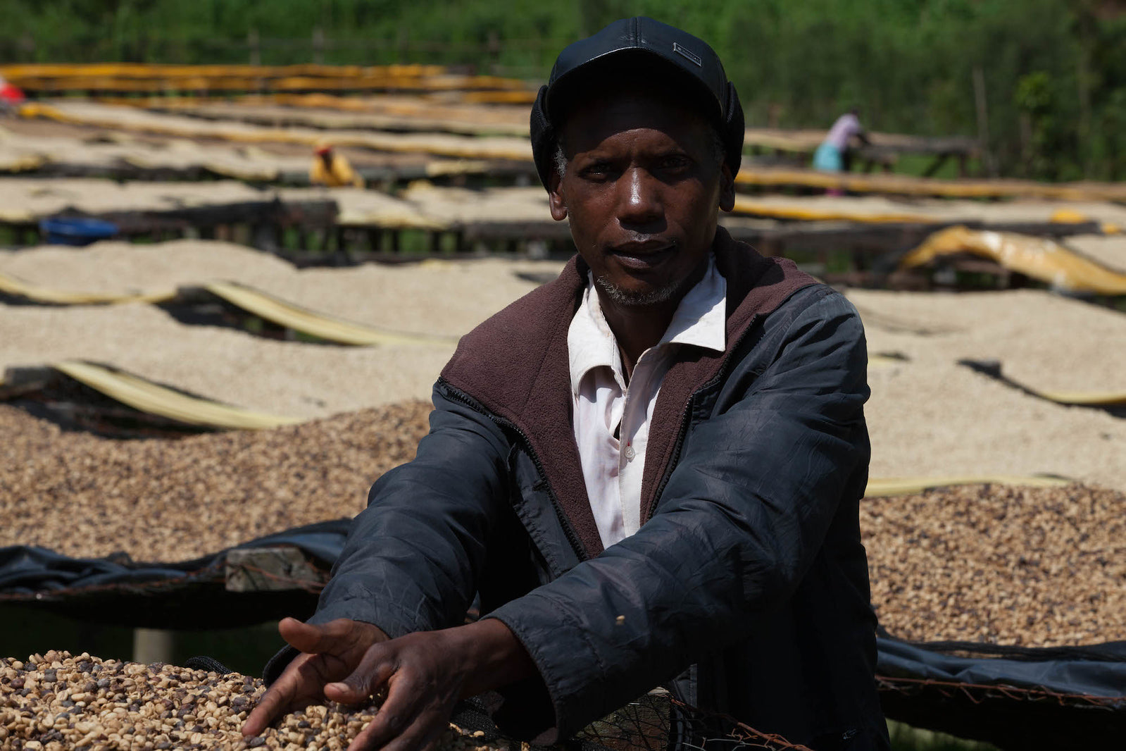 Next, the beans are dried on raised African beds for 14-21 days depending on the climatic conditions. The parchment coffee is hand picked and turned throughout to remove defects and ensure consistent drying process, as well as covered at night or during rain to protect against moisture damage. A dedicated quality controller tests the relative humidity daily until an optimum content of 12% is reached, after which the coffee is rested in parchment pending secondary processing prior to export.